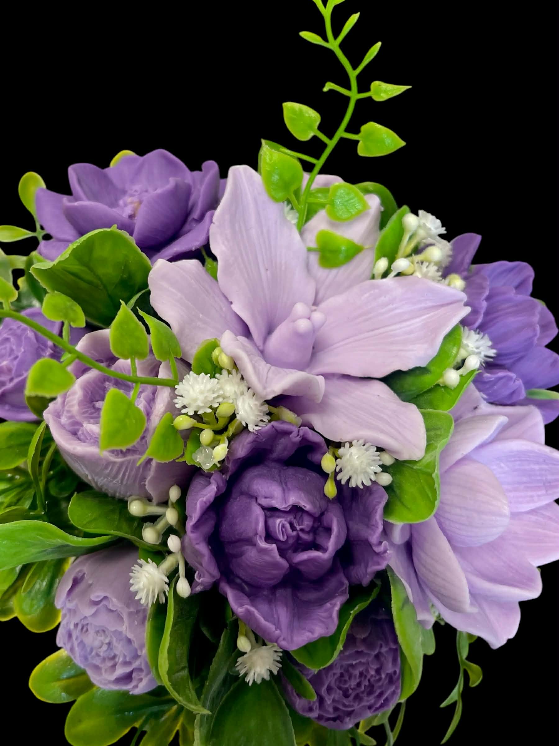 Ez a kompozíció olyan, mint egy csendes, meghitt délután… amikor minden lelassul, és csak a szeretet marad. A lágy lila árnyalatok finoman simulnak egymásba – elegánsak, mélyek, mégis megnyugtatóak. A különböző formájú virágok játékosan rétegződnek, miközben a friss zöld levelek életet és természetességet hoznak az összhatásba.
